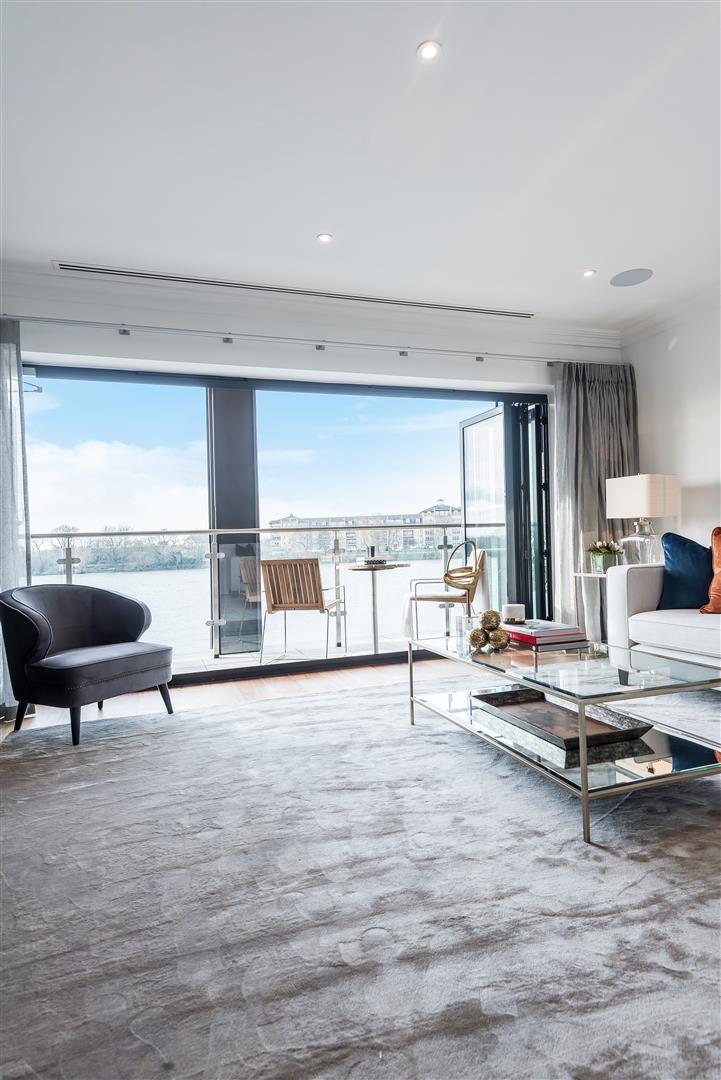 The townhouse is arranged over four floors boasting three fabulous balconies at three different levels each one overlooking the River Thames. Townhouse 3 benefits from a bespoke, high gloss ‘Macassar’ kitchen with fully integrated Miele appliances including wine cooler and a Crestron Home Automation System that controls the lighting, heating/air con and TV’s throughout the property.