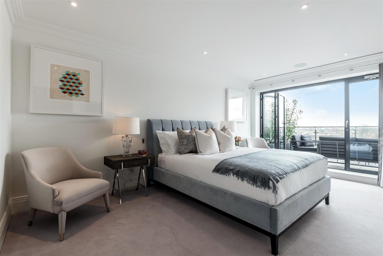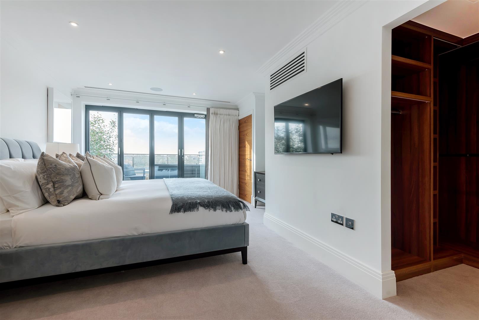 The master bedroom suite is located on the entire top floor and is arranged with a dressing room and en-suite bathroom. The terrace for the bedroom is accessed by bi-folding doors giving the master bedroom an ever-changing panoramic view.